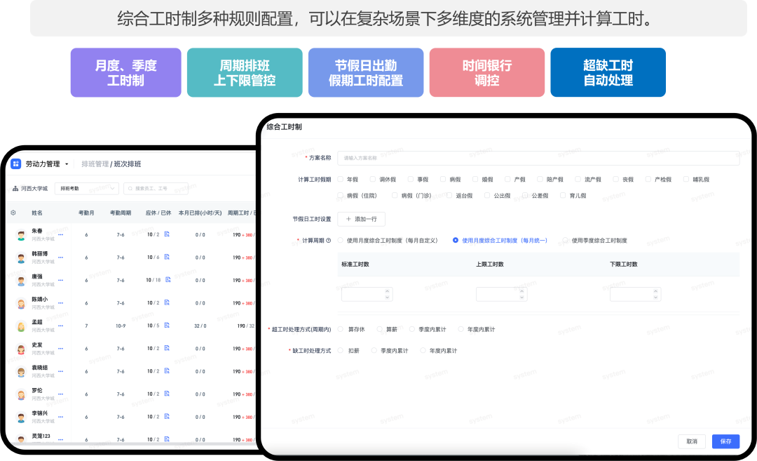 对于多产线、多门店等考勤排班较灵活的企业,系统能实现自动化循环排班的同时,也可以按照实际工作时间动态生成班次,按时段科学计薪,满足多种规则的配置和工时计算。
