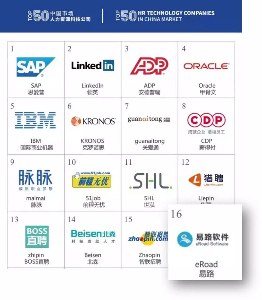 8月16日,全球首份人力资源科技公司排行榜“中国市场人力资源科技公司50强”榜单(Top 50 HR Technology Companies in China Market)由法国里昂商学院(emlyon business school)和中国领先的人力资源智库HRflag联合编制并重磅发布,易路荣登榜单名列16,比肩业内知名先行者。
