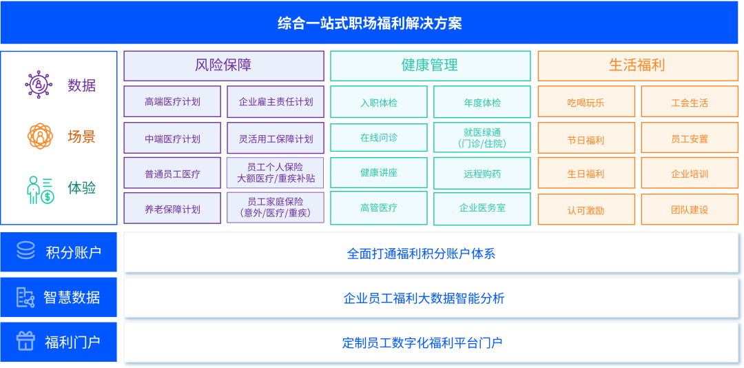 数智化时代的福利解决方案,应该是全面、灵活、可满足员工多样化需求的。以易路的综合一站式职场福利解决方案为例,围绕员工在健康管理、风险保障和生活福利的多场景,全面打通福利积分账户体系,结合福利大数据智能分析,定制专属的员工数字化福利平台门户,不仅可以有效提升管理效率,降低运营成本,同时操作便捷、兑现即时,可大幅优化员工体验。
