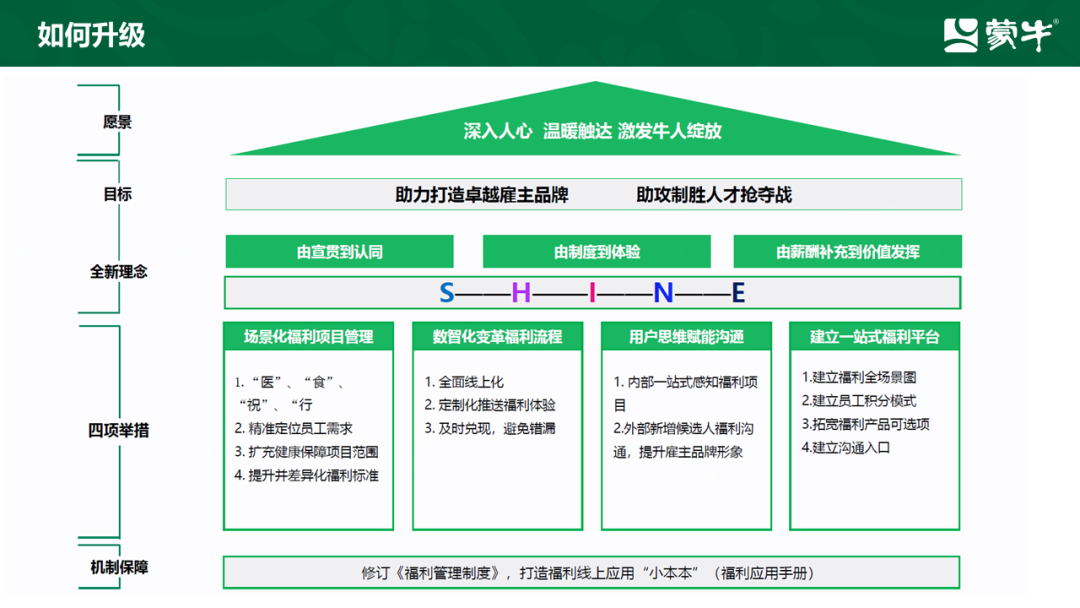 蒙牛搭建有温度、有态度、有深度的自有福利品牌SHINE·闪耀,围绕“医、食、祝、行”四大常见场景,以“助力打造卓越雇主品牌,助攻制胜人才抢夺战”为目标,施行“打造员工全场景化福利项目管理体验、数智化变革简化员工福利流程、打造员工视角福利赋能沟通体系、搭建一站式福利平台”四大举措,对员工福利体系进行全面升级。