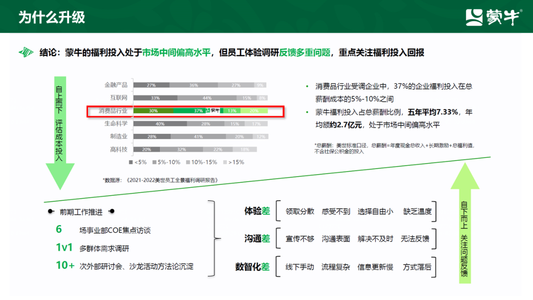 从内部来看,对HR一号位的访谈和对员工的一系列线上线下调研得出,有体验差、沟通差、数智化差三大痛点。体验差在于员工对于福利的感知度不够,选择的自由度和公司传递的温情服务不够到位,沟通差在于福利的宣传不到位,导致兑换容易过期等,数智化差在于重复性的手动操作致使运营成本居高不下。