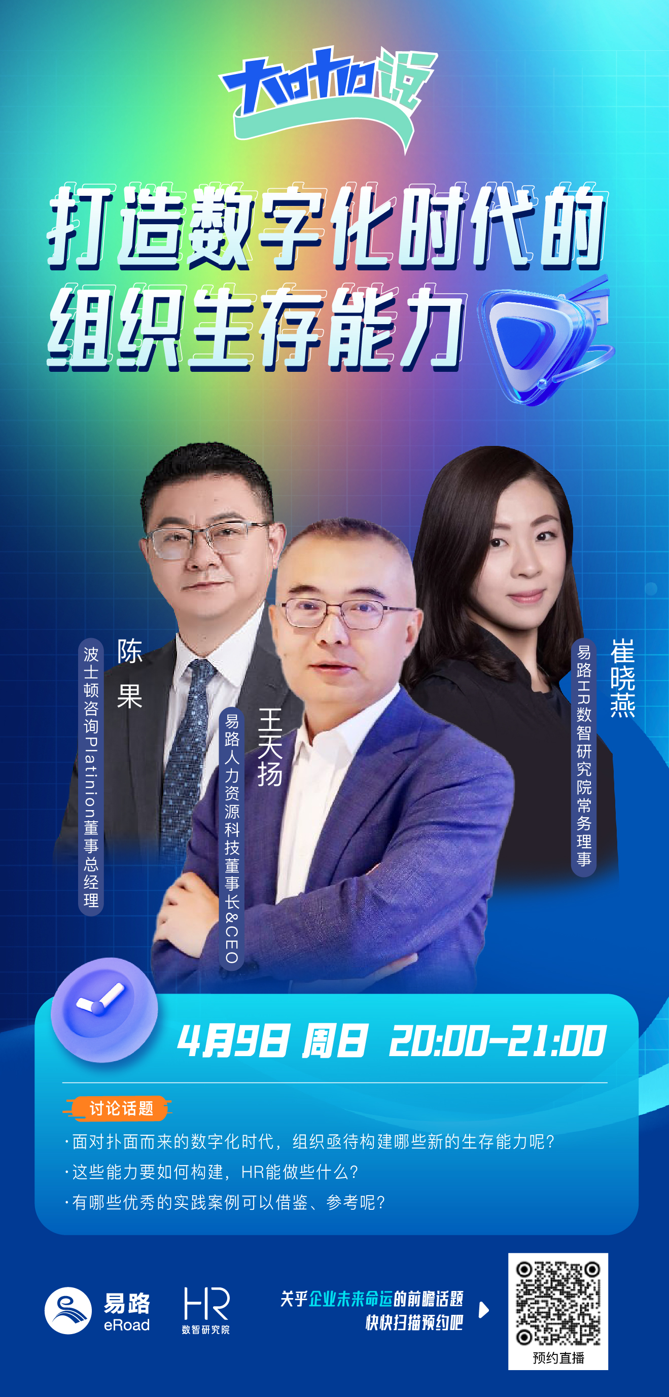 4月9日晚8点至9点,来易路“HR数智研究院”直播间,聆听两位在数字化和人力资源数字化领域深耕数十年的资深大咖,易路创始人兼CEO 王天扬先生、波士顿咨询Platinion董事总经理 陈果先生与您一起深度讨论“打造数字化时代的组织生存能力”这一关乎企业未来命运的前瞻话题,精彩不容错过,快快扫描下方二维码预约吧👇👇👇