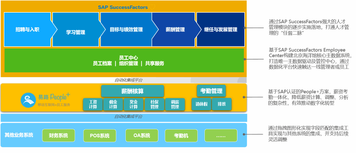 新技术催生了新的商业模式、新的经济形态,同时也促进着企业传统人力资源工作模式的进化和重生。为了快速响应新的商业环境和外部变化,北京海洋馆选择了SuccessFactors ×易路People+系统,来应对未来组织发展将面临的挑战。