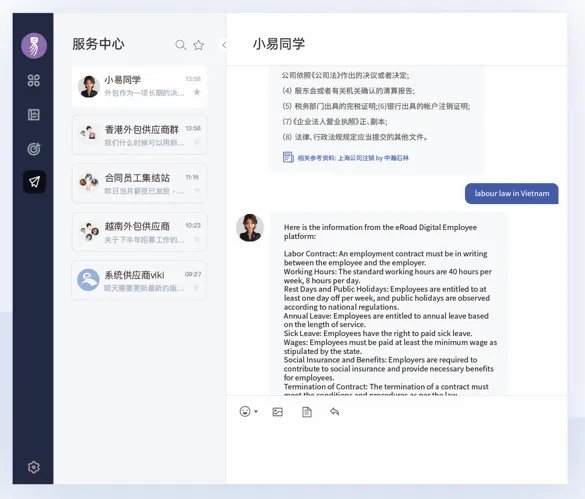 AI生成式应用的密集涌现,也为全球化管理带来了一波科技的革新热浪。不但能利用强大的语言天赋为HR消除沟通隔阂,eRoad数字员工还将AI充分融入出海场景,提供24小时不休的全球政策咨询,以及与系统紧密联动的工资查询、请休假、业务进度查询等功能。软件+AI为基座的全球人力资源服务,是企业能抢滩国际市场,更快吸纳人才、经营人才的关键。