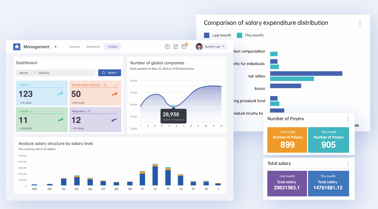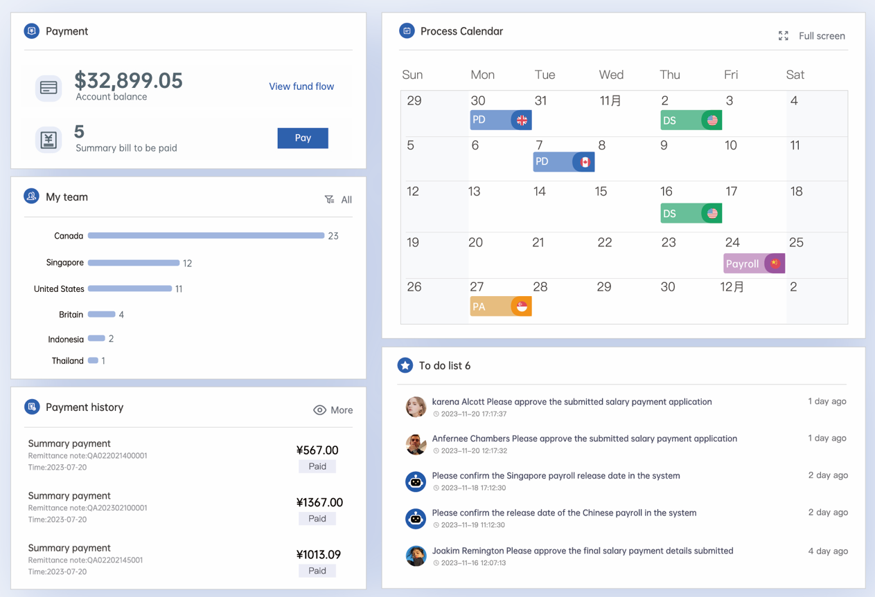 中国总部HR管理全球人员的过程中,易面临数据碎片化、流程不统一、全局不清晰等问题,需要数字化平台集中管理员工数据。eRoad 的Global 世界杯直播指南 FIFA世界杯流媒体 People+全球人力资源管理平台可围绕员工全生命周期提供多国核心人事、考勤休假、薪酬福利、组织绩效、人才发展等模块支撑,生成全球人力资源数据报告,满足成本预算管控和报表分析。