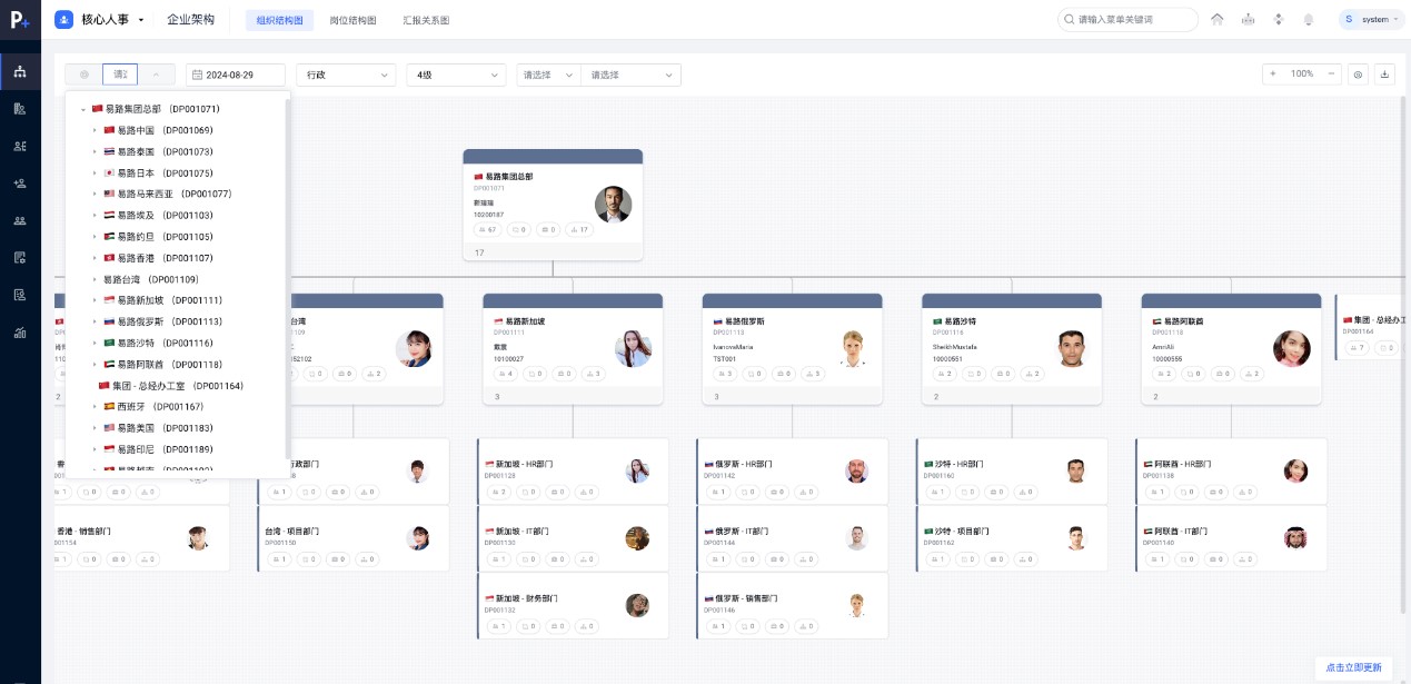 组织协同管理: 世界杯直播指南 无论企业分支机构遍布全球何地,易路都能实现跨国统一的人事流程管理 ,各个国家地区的员工都受到总部集中化的管控 。这有助于企业构建清晰的全球组织架构,提升全球组织的协同效率和战略执行力。企业可以清晰地看到不同国家和地区的人员分布、组织层级和团队构成,为全球人才配置和战略决策提供数据支持 。