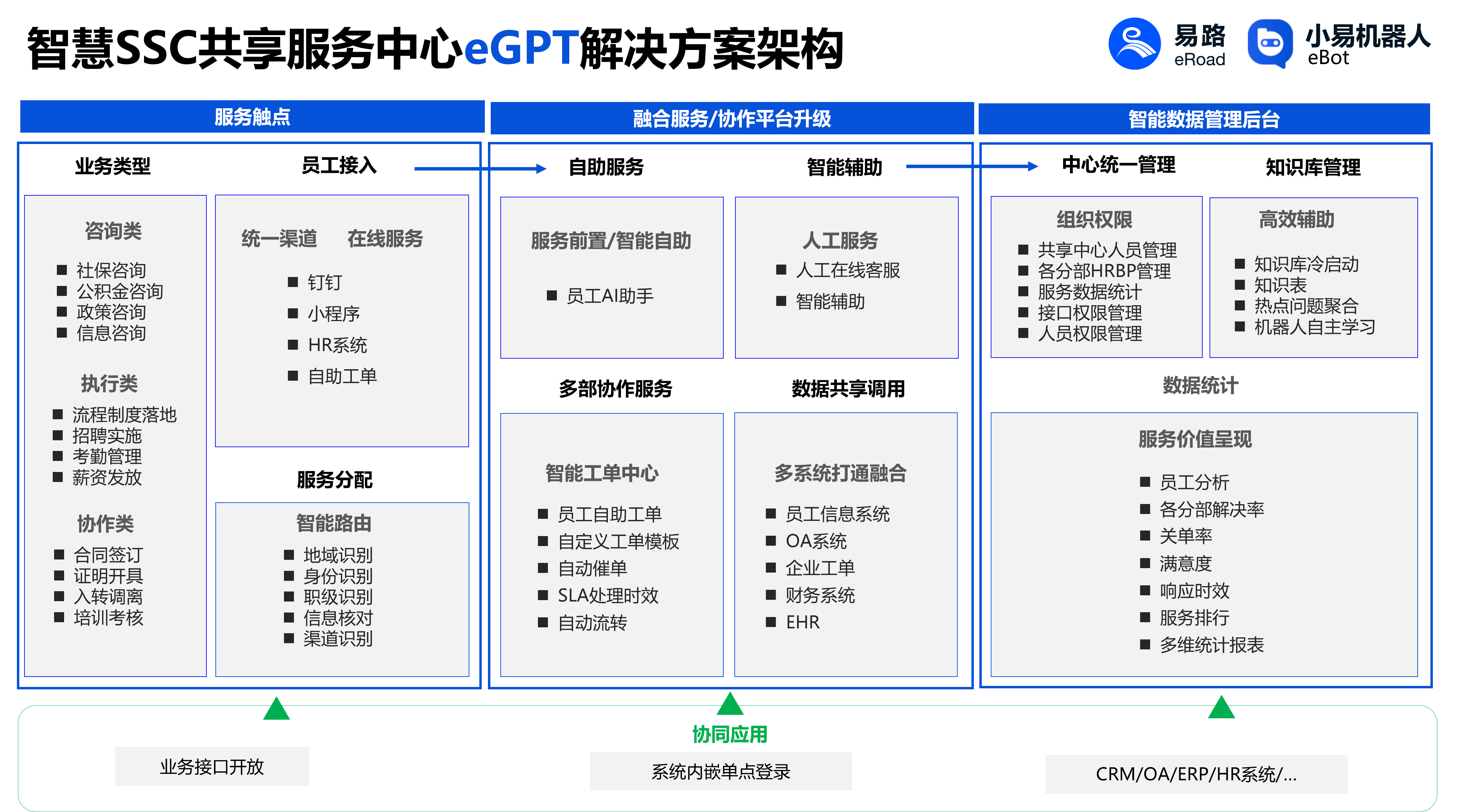 作为服务于中大型企业的人力资源“软件+AI+服务”提供商,易路以协助企业建设以人为本的SSC为己任,通过二十余年自研一站式人力资源数智化云平台和人力资源行业大模型,拥有与全球主流eHR系统成熟集成方案能力,为400万+用户提供更佳的数字化工作体验,做到支持好业务、服务好员工。