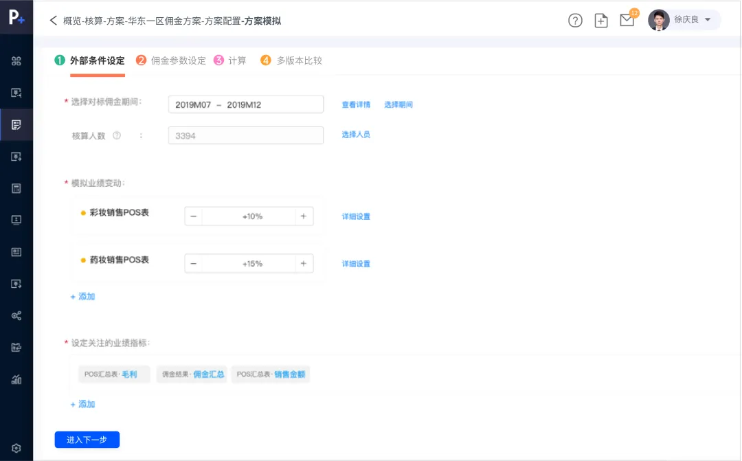 与其绞尽脑汁从各个维度去分析3套方案的成本、可能取得的结果,不如直接在P+“方案模拟”中选择对标期间,模拟业绩变动、将3套方案的关键指标及权重输入进去,即可得到在模拟条件下每套方案的佣金、业绩、毛利等对比情况。