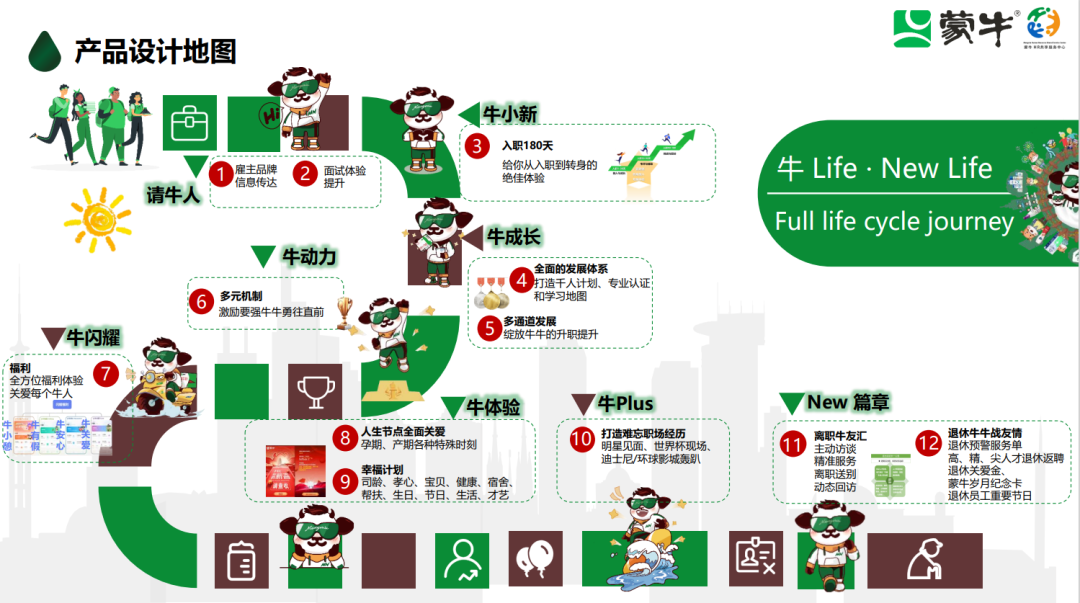 员工体验管理深度触达员工全生命周期各个节点,结合蒙牛的“牛”特色创造企业专属词条:如牛小新、牛周岁等,将人文关怀与福利待遇贯彻招聘到离职各个阶段。
