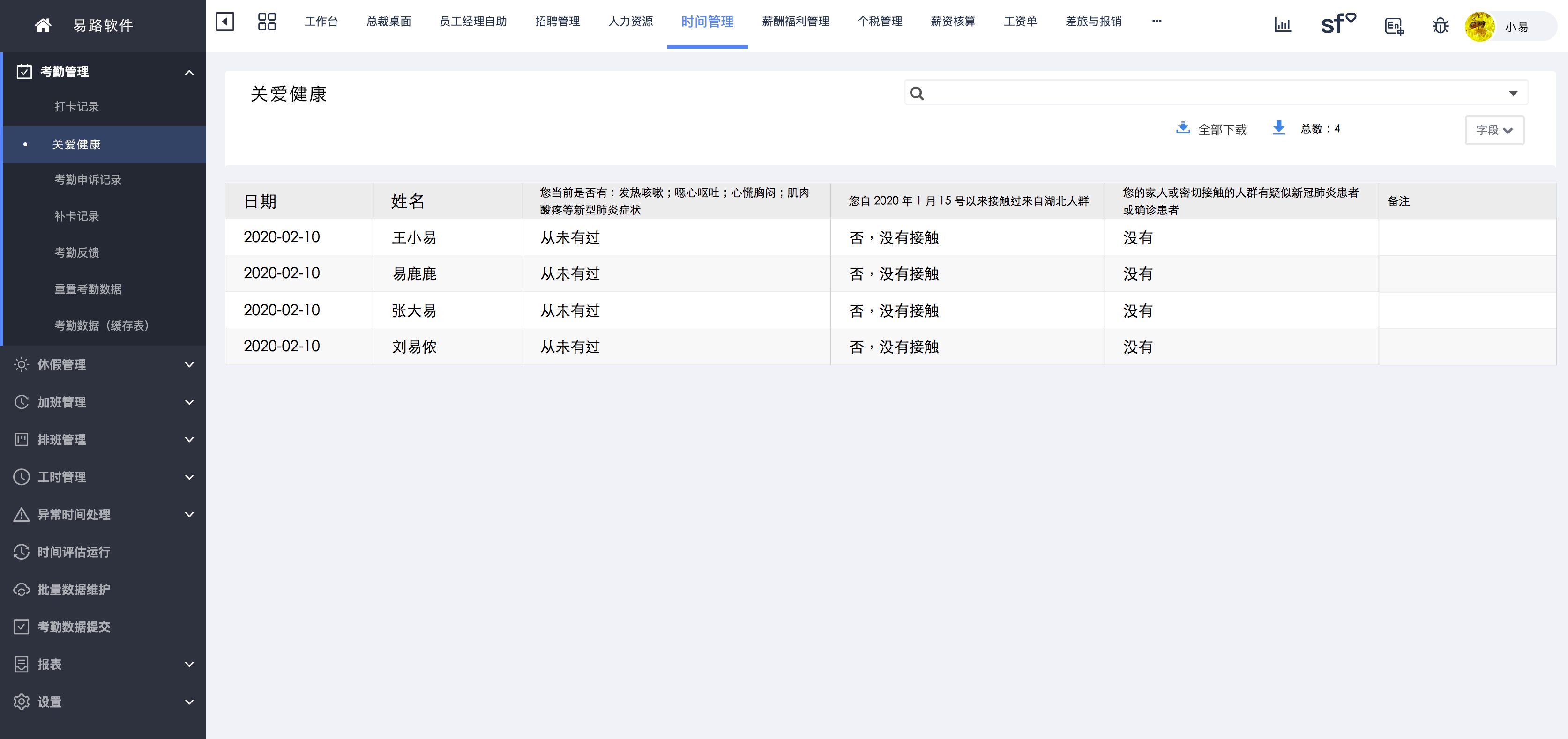 保护员工隐私,实时查看信息汇总:企业管理员可通过权限的划分,查看员工健康信息,以便保护员工隐私;在People+系统后台,实时查看员工健康信息汇总,及时关注员工健康,以便应对各种突发情况,及时做出相应的解决方案。