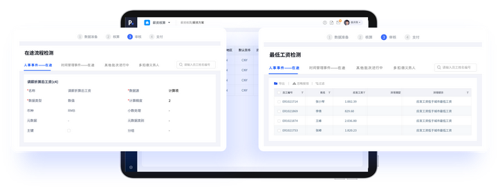 eRoadP+薪酬管理将多维度自动检测贯穿算薪前、算薪中、算薪后全流程,如在途流程、算薪结果明显差异项、低于社平工资、社保漏缴等进行及时预警、提示,以保障算薪结果的高度精准及高合规性。