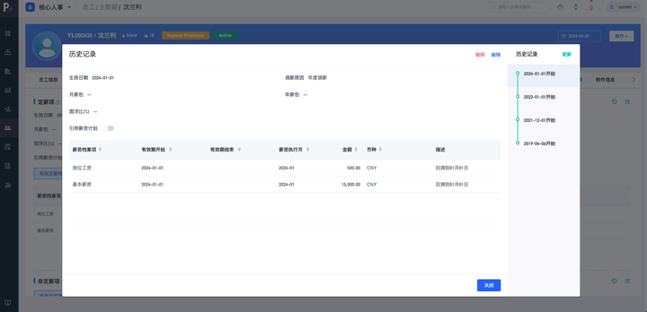 eRoadPeople+支持自动回溯计算,当员工薪资主数据发生变化,通过自动回溯功能,直接在P+核心人力中对数据进行更新,并选择生效日期,系统算薪时会根据生效日和执行月2个参数,自动进行核算补差。