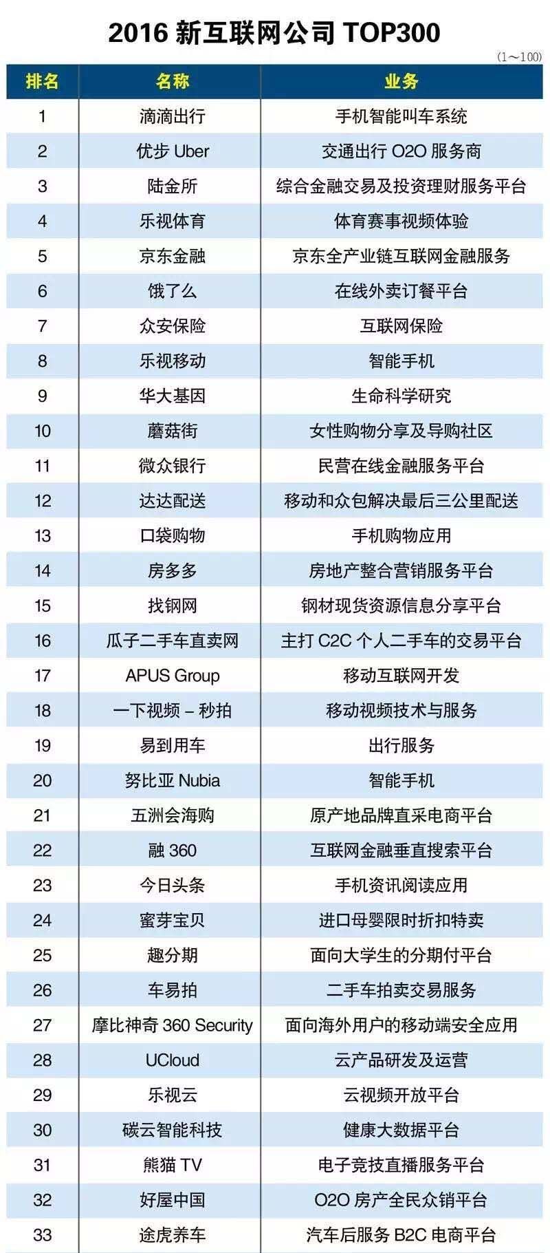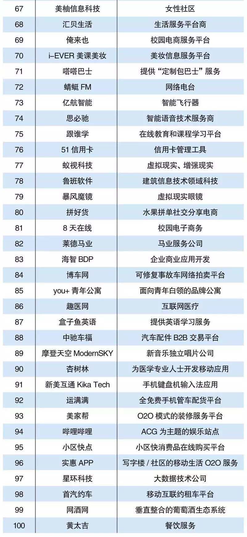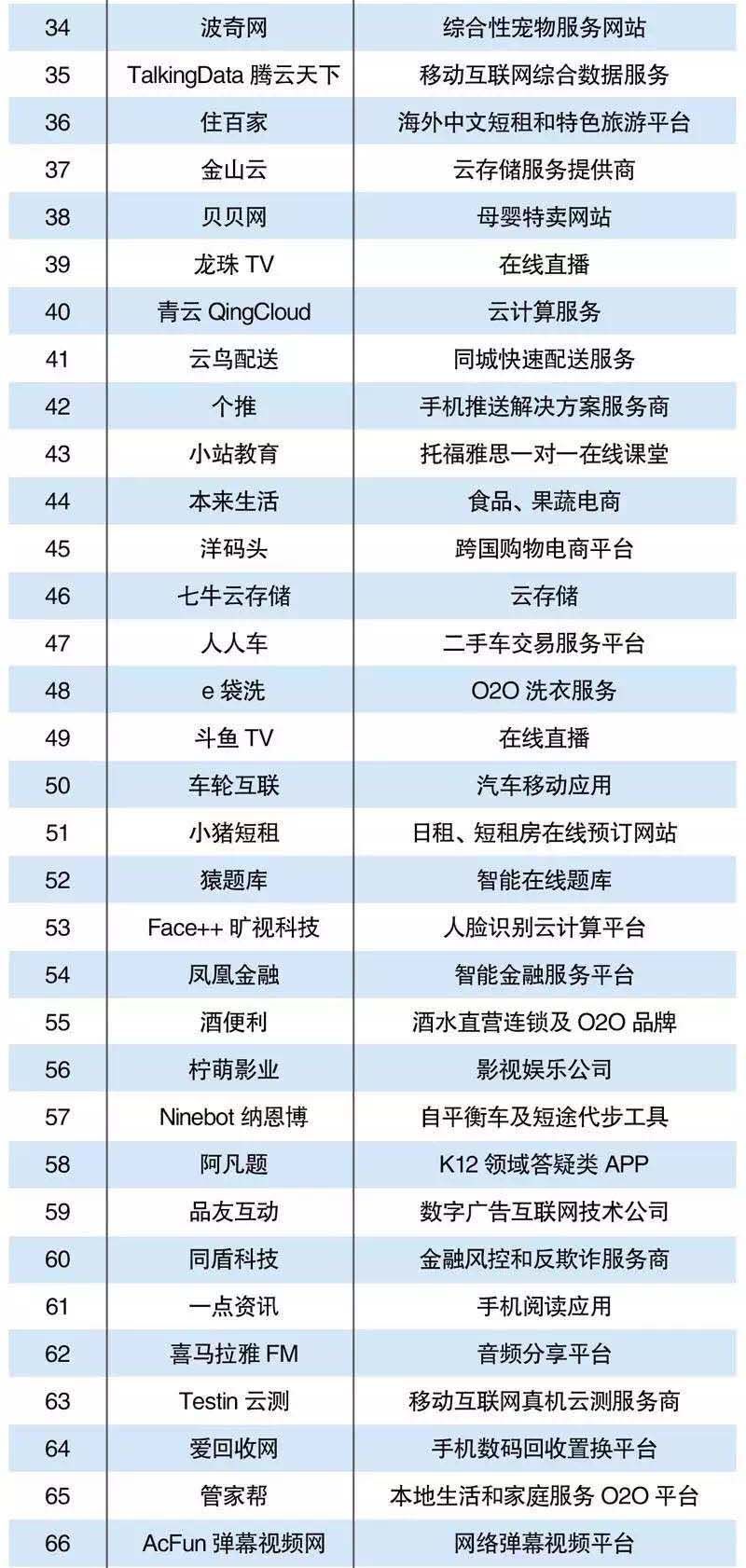 所列举的企业,均有着一种用户至上的思维,是迭代、极致、平台、跨界……等等诸如此类。其中包含那些有着天马行空的思想,晦涩难懂的技术,无畏探索未来的公司,并做了如下限制:一是创新互联网公司的创立时间较短,限定于2010年以来所创立的公司,主要依托互联网开展业务,并且企业价值得到资本的认同,获得新一轮融资,包括公开和未公开的;其二,有一定的用户数量,达到数百万、数千万甚至亿级的用户,在行业有着广泛而深刻的影响力;其三,对于已经上市和IPO的公司,不在本榜单的探讨范围之内,原因在于这些公司大多已经过发展沉淀,业务范围和商业模式经趋于稳定。